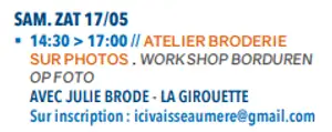 Le samedi 17 mai, de 14h30 à 17h, retrouvez-moi également pour un atelier gratuit de broderie sur photo (Sur inscription : icivaisseaumere@gmail.com)